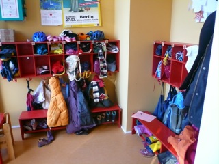 Jedes Kind hat sein eigenes Fach in der Garderobe, die auch den Wochenplan und wichtige Aushänge für Eltern beherbergt. Hier beginnt der Tag – ein zentraler Treffpunkt, an dem die Erzieherinnen die Kinder herzlich willkommen heißen.